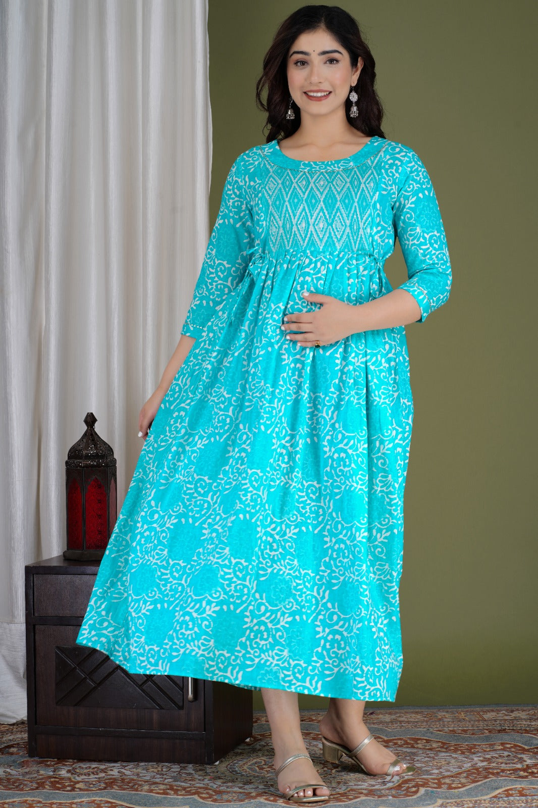 Presenting the Women's Pure Cotton Printed Both Side Invisible Vertical Zipper Feeding Kurti | Maternity Gownâa seamless fusion of elegance, comfort, and functionality, specially crafted for expectant and nursing mothers. Designed with care, this gown ensures you feel confident and at ease throughout pregnancy and nursing.